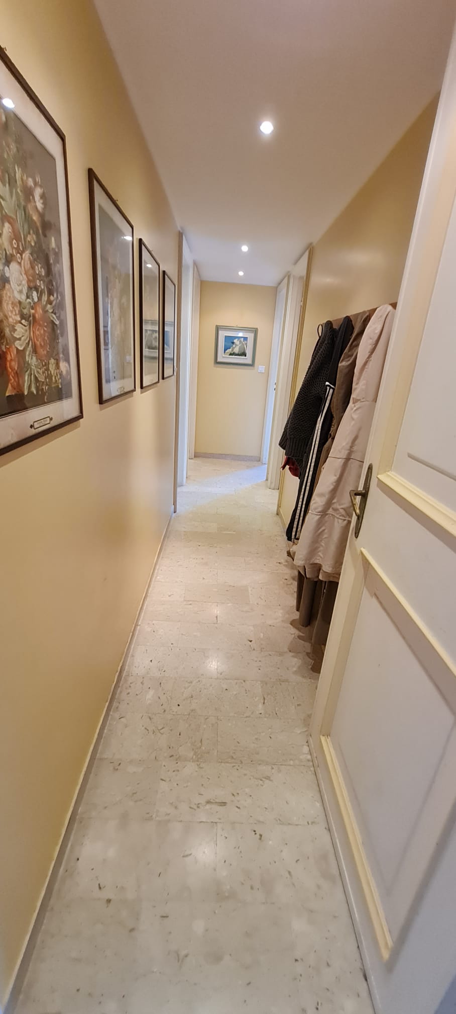 • Corridoio luminoso con pareti tinte in toni caldi, decorato con quadri floreali e dotato di illuminazione a faretti incassati.